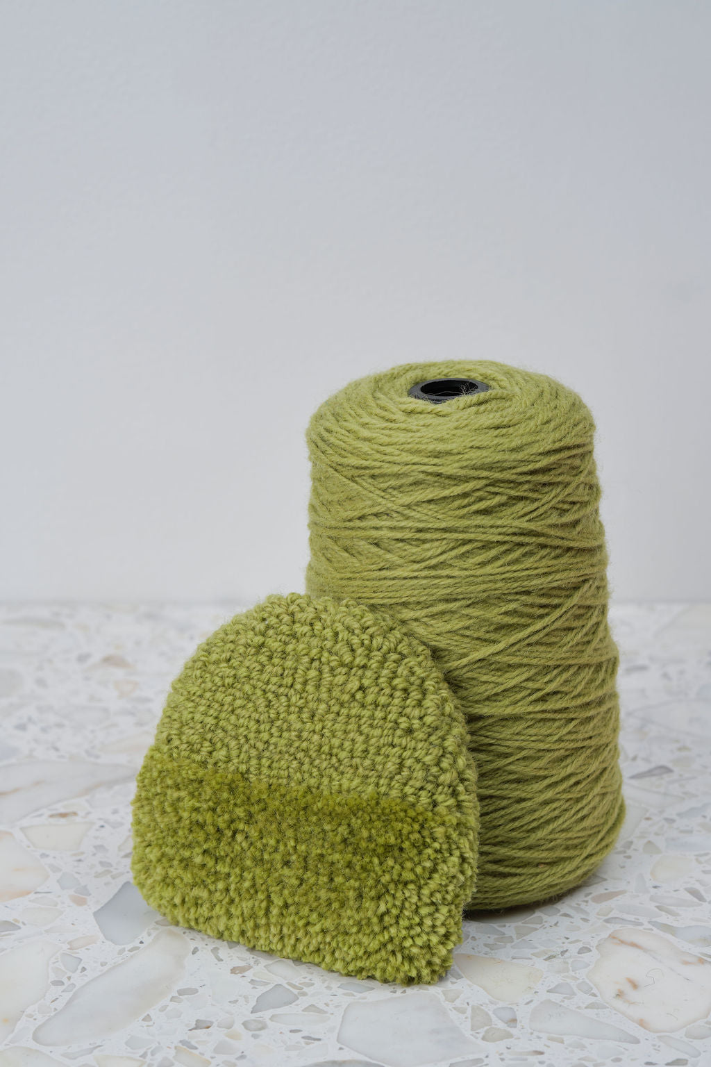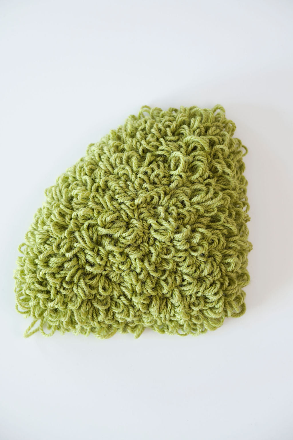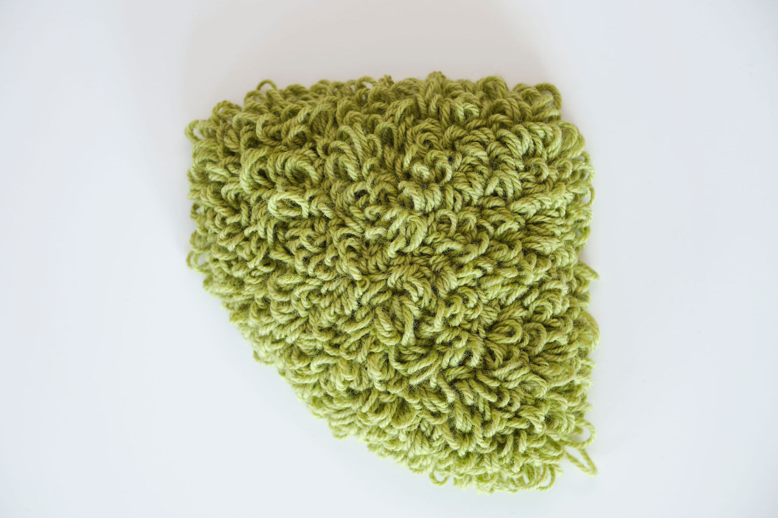 Teoksen pinta koostuu korkeasta silmukkapinnasta.