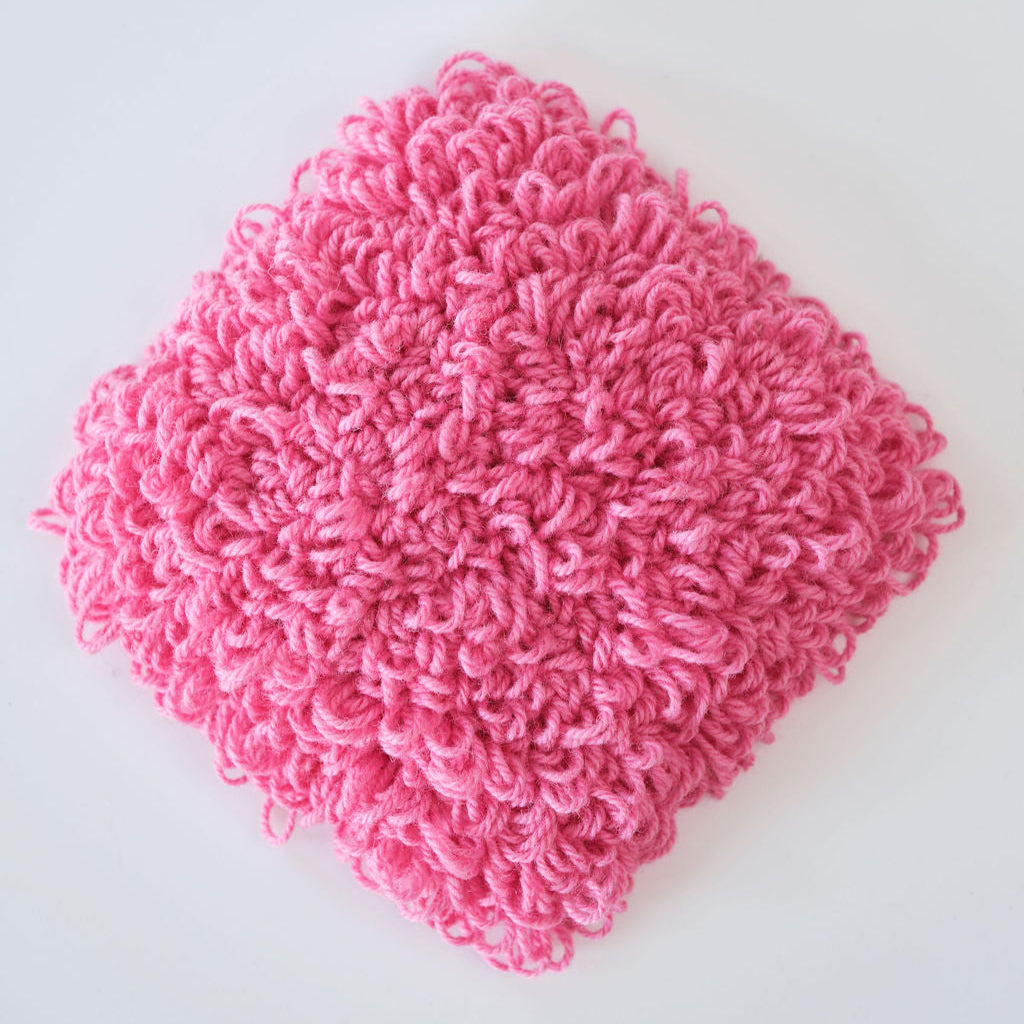 Teoksen pinta koostuu korkeasta silmukkapinnasta.